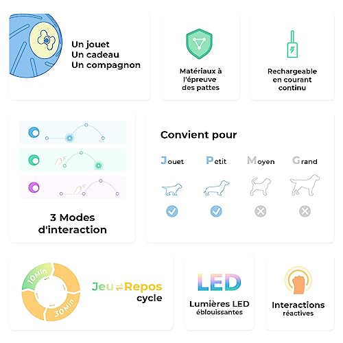 Specification: Cheerble Jouet Chien Interactif Wicked Balle SE, Intelligent Jouet Auto-Rotative pour Chiens Petites Races Moyennes, avec 3 Modes, lumière LED modifiable, Rechargeable par DC, IP65 étanche (Bleu)