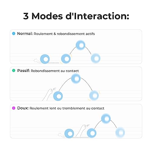 【Jouet Chien Interactif Intelligent & 3 modes LED】 Cheerble Wicked Ball SE roule, secoue ou rebondit automatiquement lorsqu’il est allumé. Il dispose de 3 modes d’interaction : normal, passif et doux. Les lumières LED clignoteront également et changeront en conséquence.