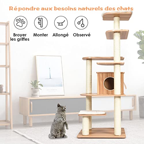COSTWAY Arbre à Chat en Bois de 179 CM, Centre d’Activités pour Chat à Plusieurs Niveaux en Peluche, Tour à Chat avec Condo et Poteaux en Sisal, Charge 15KG pour Chaque Couche, Naturel