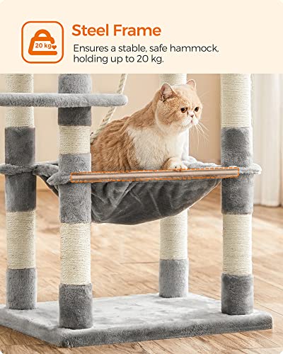 Feandrea Arbre à Chat Hauteur 143 cm, Tour de Jeux pour Chat, avec 11 Poteaux à Griffer, 2 Plateformes, 1 Niche, 1 Hamac, 2 Pompons, en Tissu Peluche, Plusieurs Niveaux, Gris Clair PCT15W