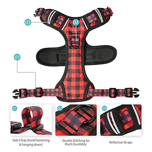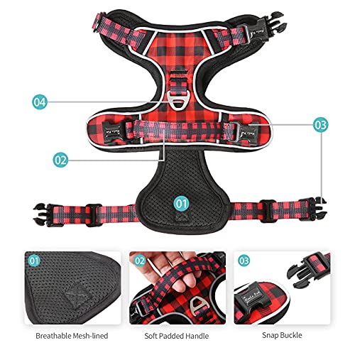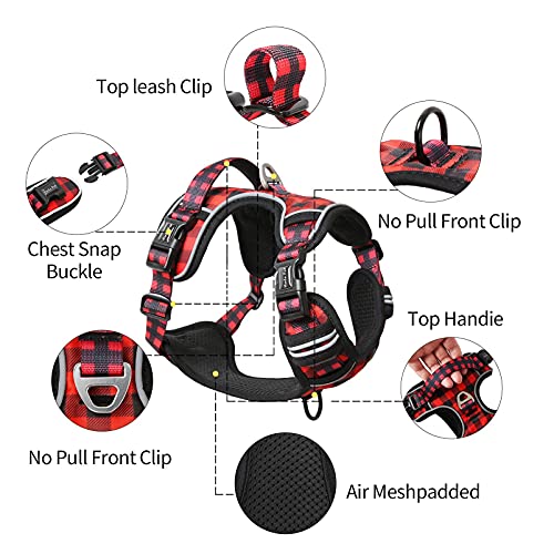 HEELE Harnais Chien, Harnais pour Moyen Grand Chien Anti Traction Réfléchissant Harnais avec Poignée Rembourrée, 1 Boucle sur la Sangle Droite cou Rendent Facile Mettre et Enlever, Noir-Rouge Plaid, M
