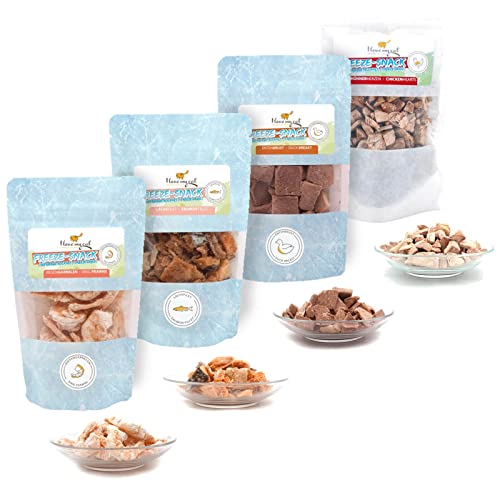 Snack Glacé pour Chats – Magret de Canard: 100% magret de canard Snack glacé pour chat – crevettes royales: 100% gambas Freeze Snack pour Chats – Filet de Saumon: 100% filet de saumon Friandises glacées pour chats – C?urs de poulet: 100% coeurs de poulet