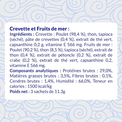 Poulet (98,4 %), thon, tapioca (séché), pâte de crevettes (0,4 %), extrait de thé vert / Poulet (90,2 %), thon (8,5 %), tapioca (séché), extrait de thon (0,4 %), extrait de pétoncle (0,2 %), extrait de crabe (0,2 %), extrait de thé vert.