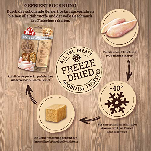 8 in 1 meaty treatsergänzungsfutter für hundefreeze dried meaty treats mit 100 % huhnverwöhnen sie ihren hund mit köstlichen 8in1 meaty treats!unsere rezeptur mit 100 % hähnchenbrust enthält sämtliche nährstoffe von leckerem fleisch!die zutaten wurden schonend gefriergetrocknet